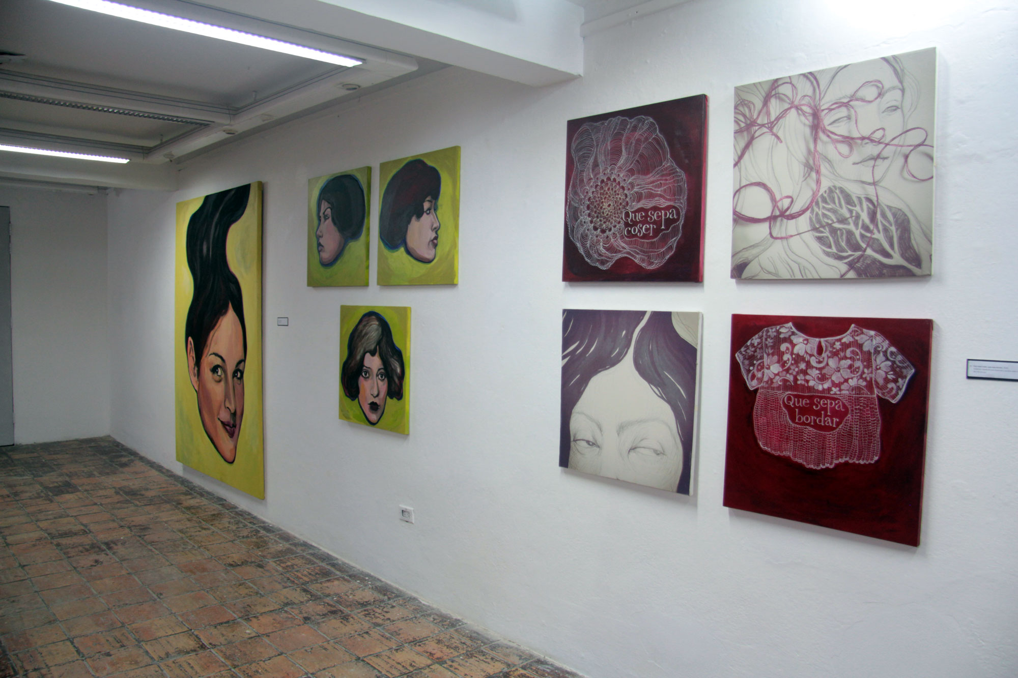 SM: Esta zona hay que trabajarla con especial cuidado, específicamente porque hemos incluido en el catálogo el texto de Jorge Villacorta Chávez, eso indica la importancia que le estamos dando a la pintura dentro de tu discurso. Pero las pinturas son quizás las piezas más evidentemente críticas de la muestra, hasta ahora al espectador-viajero le debe haber ido muy bien con el mapa, incluso en las situaciones definitivamente espinosas, ha ido avanzando y seguramente entendiendo y de pronto tiene que enfrentarse a estos rostros desmesurados y hasta amenazadores. “Está muy fría” y “Está muy caliente”, no son piezas fáciles, aquí te has desprendido de las insinuaciones y es el momento en que eres directa y nada condescendiente; si entre ellas colocaremos el díptico “Que sepa cocer, que sepa bordar, que sepa abrir la puerta para salir a jugar”, ya todo está dicho y la puerta está abierta. Es una oposición expresa a la asignación de los roles tradicionales femeninos, es el momento del portazo, del ruido, del estruendo y está acentuado con los grandes formatos. No se trata de una amenaza en sí, sino de una toma de posición y es una posición de poder, no hay fondos floridos, no hay vestidos sensuales, todo lo que pudiera suponerse superfluo lo has eliminado en función de estas cabezas que dominan el cuerpo y sus ornamentos.