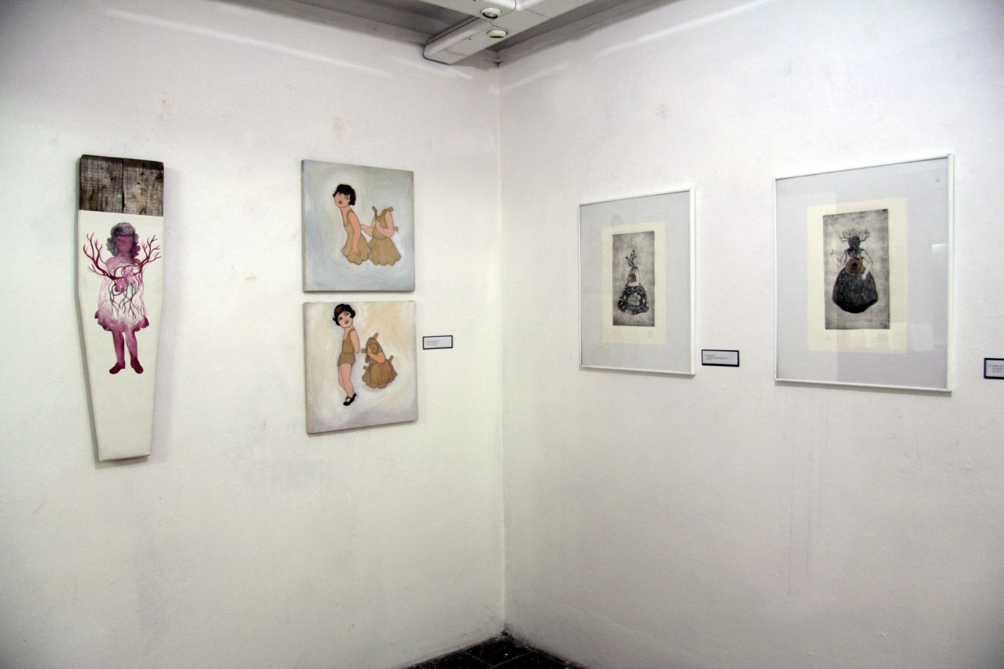 SM: Aquí vamos a ver que nos dice la galería, en principio me parece bien crear un ambiente, darle un carácter instalativo, pero no estoy del todo de acuerdo contigo en usar los paneles de madera e incluir el espacio de los aires acondicionados. Hasta la zona de la pared me parece muy bien, especialmente por la dimensión de las piezas que vas a colocar allí y porque es una zona muy íntima de la galería, un lugar donde el público se detiene, y las piezas que estarán allí son muy fuertes. Mirando las imágenes (especialmente la de la mosca y la cabeza en el plato rojo), he pensado en el texto de José Manuel Noceda y esa afirmación de que puedes “… parecer ingenua y cándida, pero a la vez resultar todo lo contrario, perversa, visceral e incisiva…”. Visualmente son piezas fuertes, aunque puedan parecer tiernas y candorosas, las líneas ascendentes de los cabellos femeninos, la libertad del movimiento del pelo y todo aquello en que se transforman, remarcado con las ramas, las aves, habla del escape, de desamarrarse y de salirse de la norma, de un discurso de oposición a lo establecido, no son mujeres precisamente dóciles. Y van a estar ubicadas en un espacio donde es necesario detenerse, creo que es la mejor colocación posible.