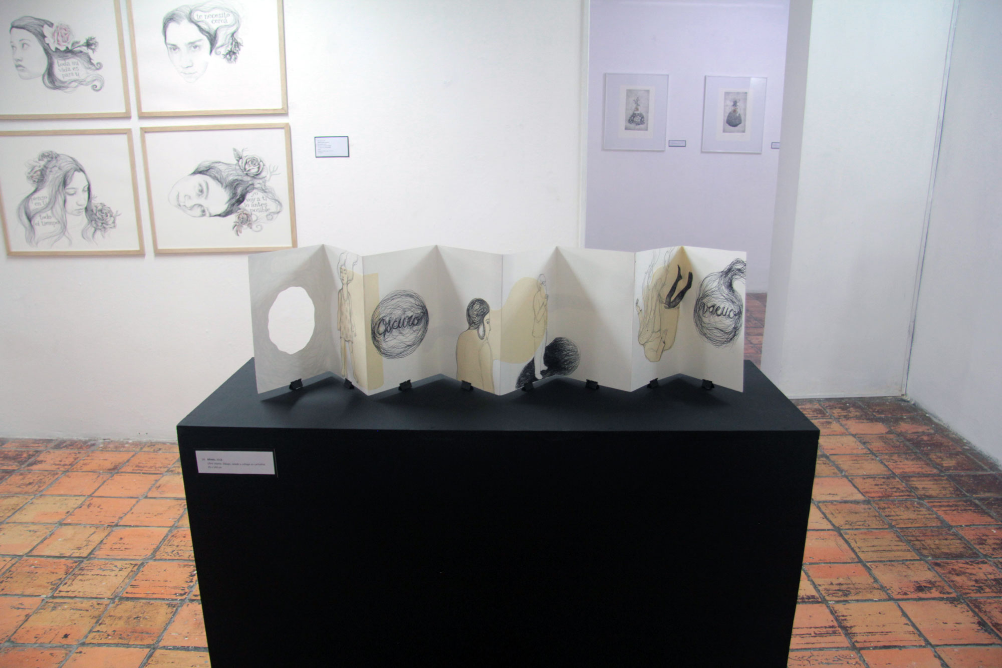 Si la elección final para esta zona del libro-objeto es la pieza “Miedo”, me gustaría desplegarlo por la parte en que está la figura de la niña saliendo de un círculo y luego mostrar bien la zona del círculo calado. Esto sería por la repetición de la forma circular, que ya está en las pinturas y ese efecto que el círculo crea en la historia contada en el libro. El círculo condiciona la relación de encierro y a la vez de apertura y desde el principio estamos hablando de crear ventanas, hendiduras para visualizar los conceptos de la exposición ¿Esta es una historia de miedo?, o se trata de romper el círculo, de escapar de lo designado y salir, posiblemente por la puerta que dejamos abierta antes…