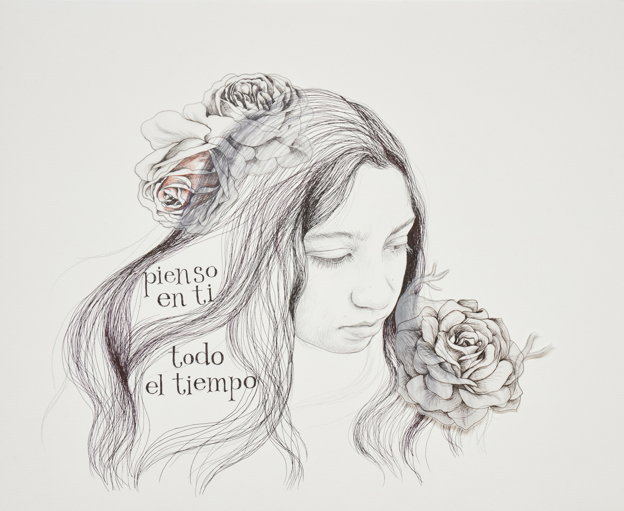 El nombre de la exposición y lo que simboliza deberá estar expuesto desde el inicio del trabajo. Creo que la selección de la pieza “Bonita II” y la forma en que la has trabajado, es ideal para explicar esta idea. El cuerpo de la niña está dando casi todas las claves, primero las líneas que cubren la silueta, tatuadas, dibujadas, trazadas sobre el cuerpo, están hablando del binomio cuerpo-mapa y haciendo alusión a la exploración, al viaje. El viaje en muchas culturas tiene una simbología de búsqueda y liberación, de transcurrir por la vida y superar los problemas (ya me dirás que otras veces he escrito sobre esto, pero es que probablemente la idea del viaje como símbolo de un proceso de iniciación y búsqueda del perfeccionamiento personal, el viaje como proceso espiritual, me obsesiona un poco). Con “Bonita II” tenemos el mapa, el anuncio de que esta especie de peregrinaje tendrá una guía (el propio mapa) y este es el cuerpo femenino; al centro está la casa, en el ombligo del cuerpo, así desde el propio mapa estás anunciando de que este viaje –la exposición, las obras, tus exploraciones personales– está íntimamente ligado a un “asunto de mujeres” a lo que se supone que sea su mundo, su territorio. La complejidad del trazado de la pieza sugiere el verdadero sentido de esta: el cuerpo cartografiado, la casa –con su dualidad de emporio y cárcel– al centro, y el árbol superpuesto, con sus raíces esparciéndose por la falda, en la zona de la matriz, la vagina, la fuente de la vida, y los retoños subiendo, penetrando la casa, atravesando el corazón, para convertirse en ramas fuertes en toda la zona de la cabeza y sobre esta, la rama que sale del cuerpo.